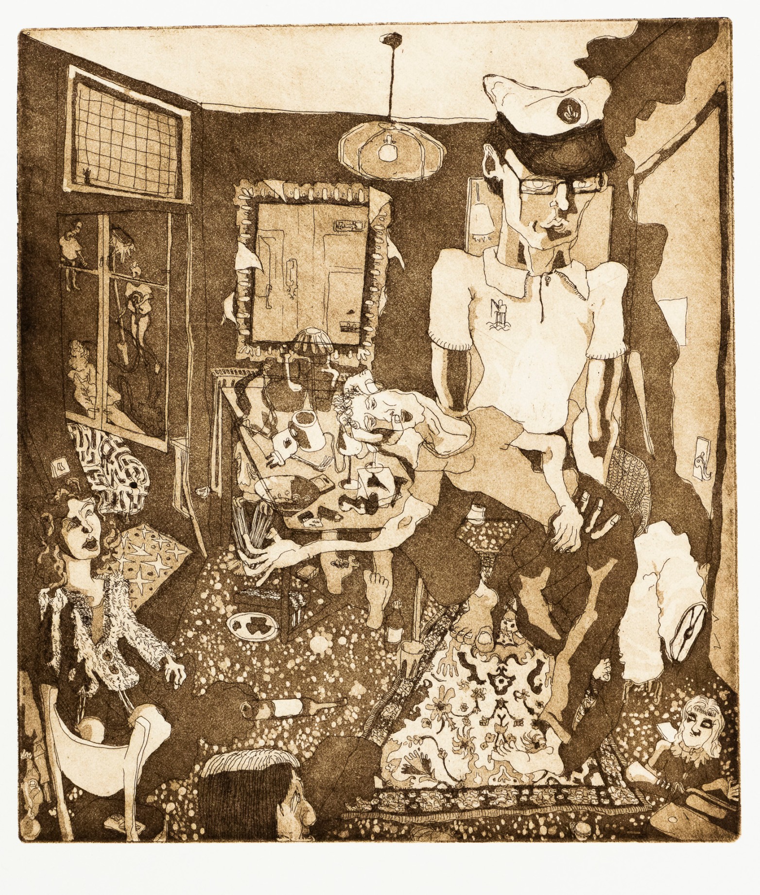 This etching (intaglio print) drawn from memory, depicts the 'Afters' taking place in the artist's Glasgow flat.